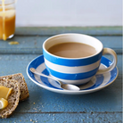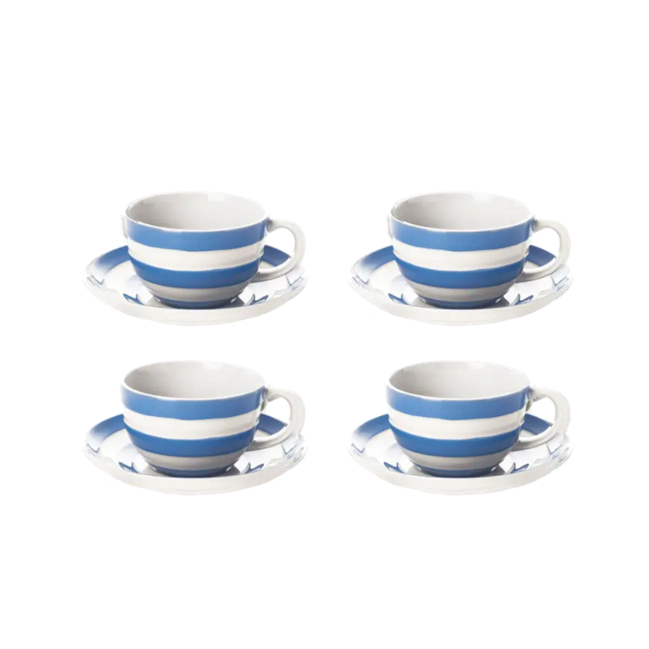 A Cornishware Blue cup and saucer set of four, perfect for serving your guests tea or for your morning cup of tea or coffee.